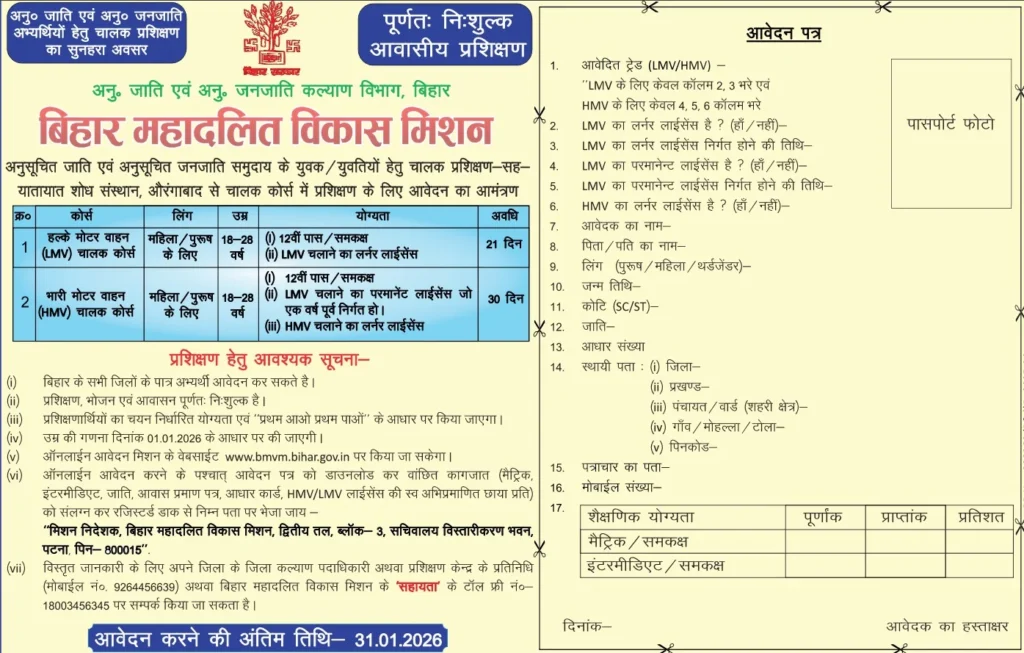 बिहार सरकार द्वारा बिहार महादलित विकास मिशन के अंतर्गत Bihar Free Driver Training Yojana 2026 की शुरुआत की गई है। इस योजना के तहत SC/ST वर्ग के योग्य युवक-युवतियों को निःशुल्क गाड़ी चलाने का प्रशिक्षण दिया जा रहा है, ताकि वे रोजगार एवं स्वरोजगार के बेहतर अवसर प्राप्त कर सकें।
