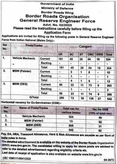 BRO की ओर से Vehicle Mechanic, MSW (Painter) और MSW (DES) समेत कुल 542 पदों पर भर्ती की आधिकारिक अधिसूचना जारी की गई है 📢।