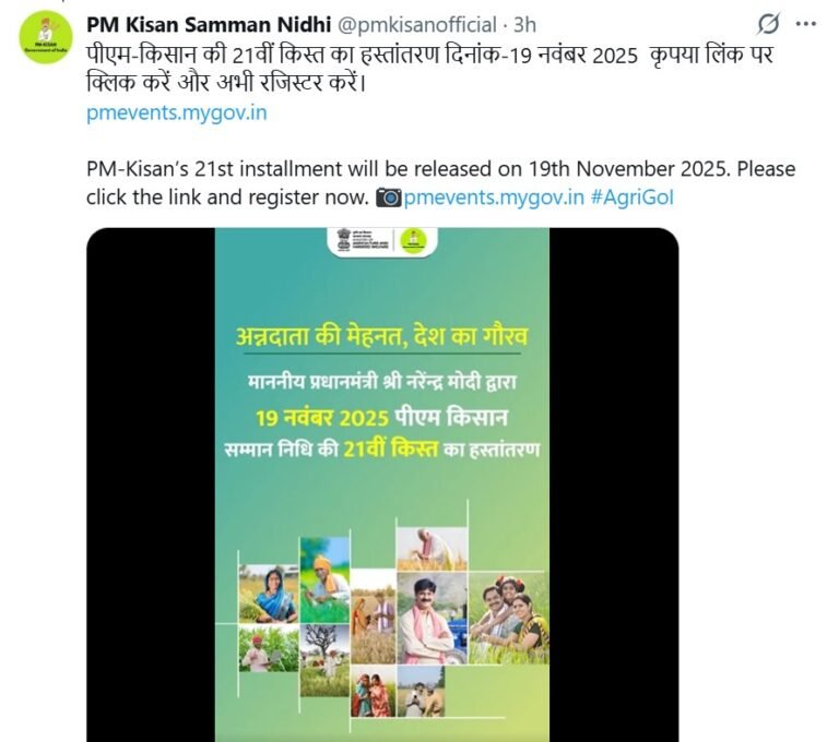 | PM Kisan Yojana 21st Installment Date | 19th November 2025 |