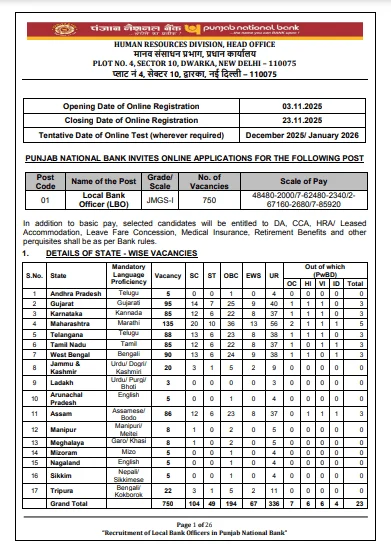 तो खुश हो जाइए 🥳 क्योंकि Punjab National Bank (PNB) ने 750 पदों पर LBO भर्ती का आधिकारिक नोटिफिकेशन जारी कर दिया है ✅