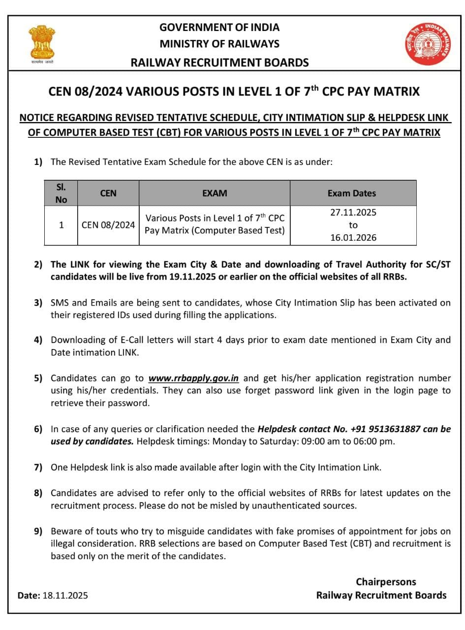 👉 RRB ने परीक्षा तिथि घोषित कर दी है — परीक्षा 17 नवंबर 2025 को आयोजित होगी